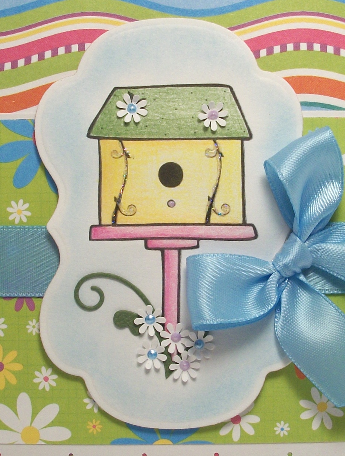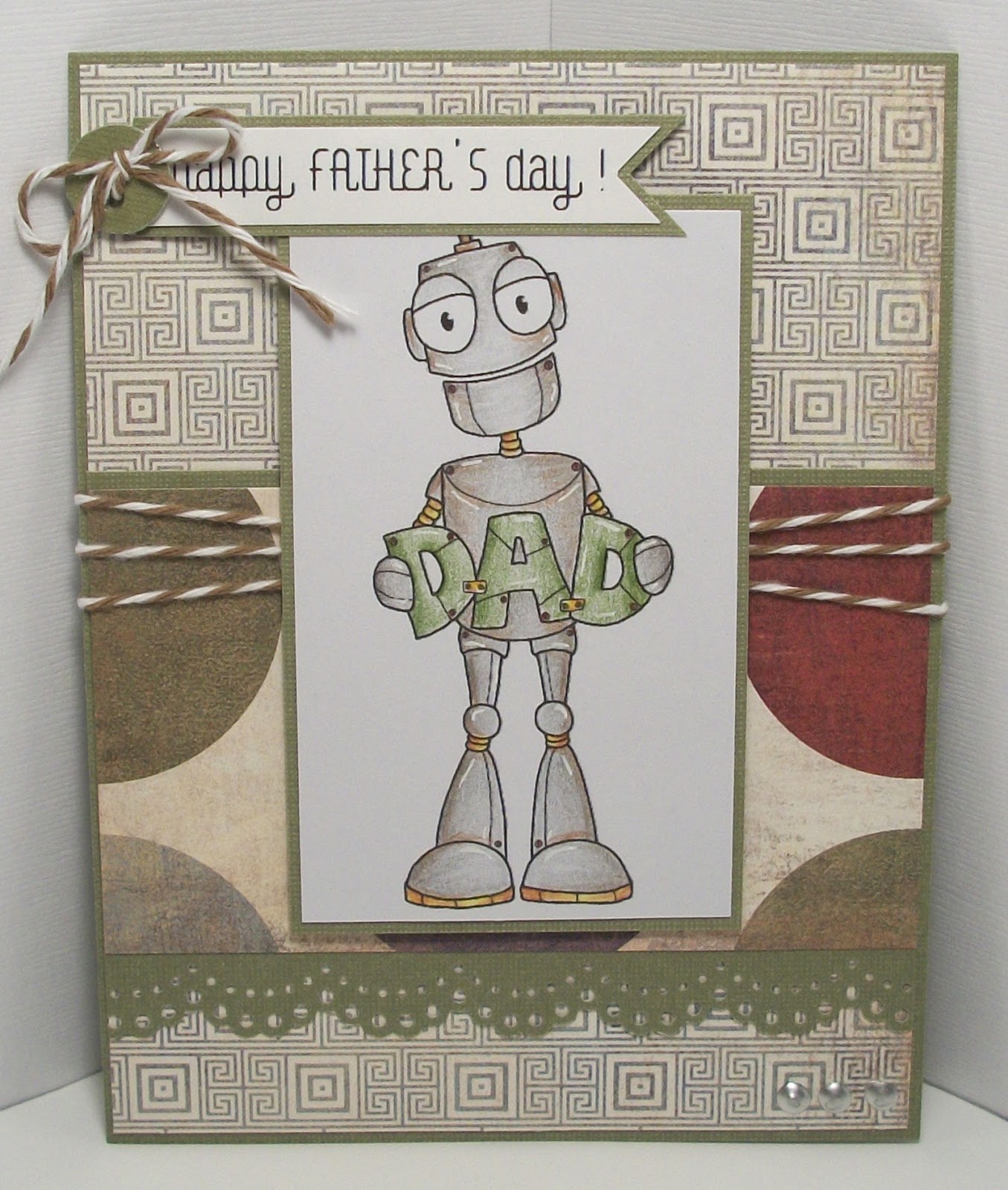 Anyhow, I took a little inspiration from some cards on The Twinery's blog and cut out some circles in my washi tape background. That whole panel is affixed with mounting tape so it stands off the blue background and helps the twine stay level with the washi tape. The Twinery provided us with a fabulous little package of their yummy twine, so I chose colors that coordinated well with my washi tape. Then just globbed some glue down in the circles and spiraled up the twine! I added matching gems to the centers to help cover up the frayed ends of the twine.
