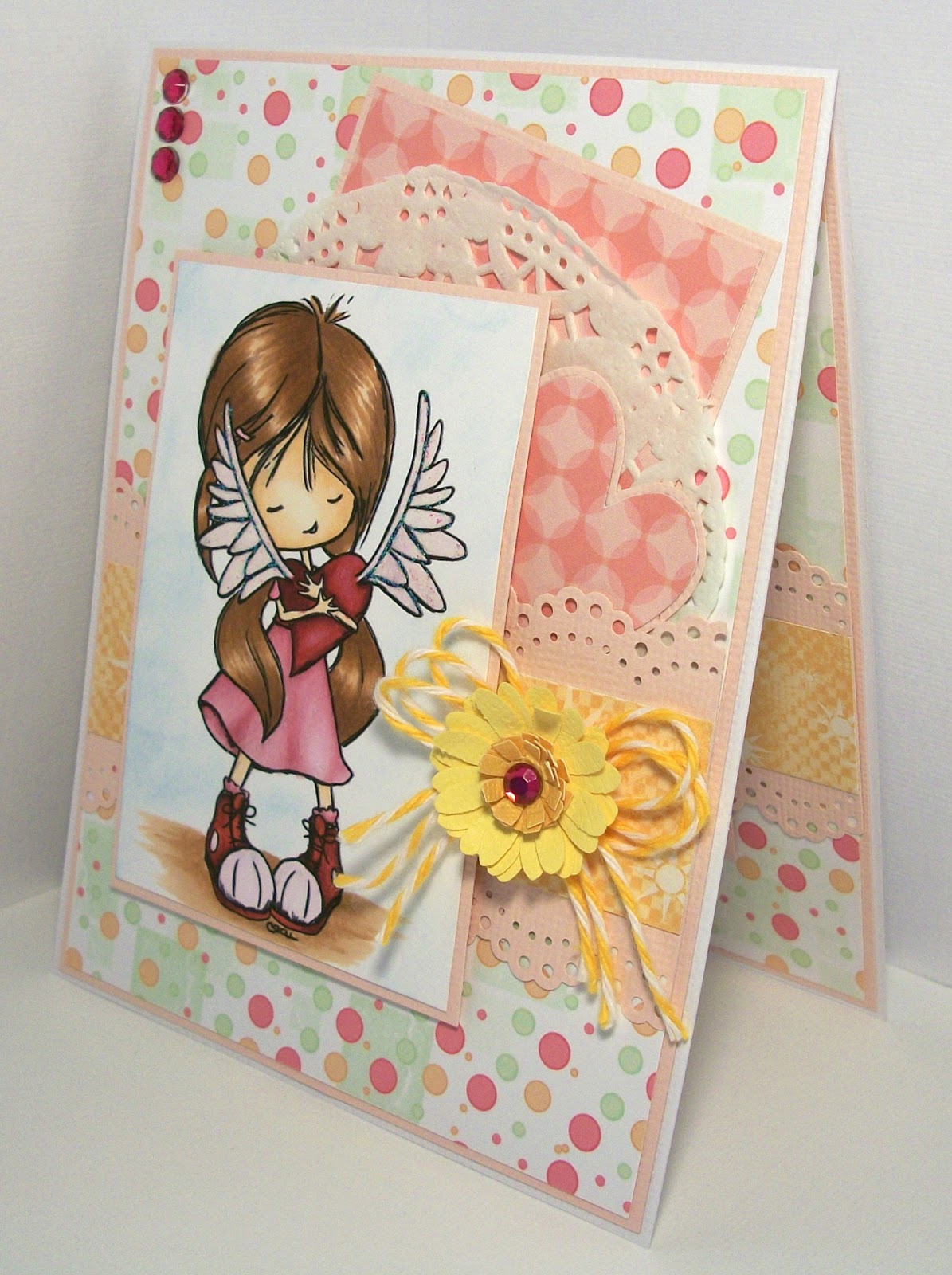 I threw in a cute little doily behind the image and cut out a small little heart as well. That was supposed to go behind the flower, but it just didn't work...so I tucked it behind the image. The daisy is just a set of punches layered together and placed on top of a triple strand twine bow.