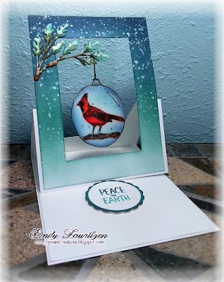 After the embossing was done, I threaded a string through the back center of the ornament and into the frame so it's suspended in the window like a spinner card.  Cut out a cute branch and added some ink and puffy snow stuff and then attached it so it looks like the ornament is hanging from that branch.