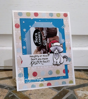 For my card, I really wanted just a simple little kitty in a santa hat. But I didn't have anything like that in my stash...so I had to scratch my brain a little bit and try to figure out a way to finagle one together. What I ended up doing was using the head of the chimney kitty in Santa Paws Newton and adding it to the body of the kitty in Newtons Costume Party...and it worked! I have a simple kitty I can color however I want, and he's wearing a santa hat! Love it!!