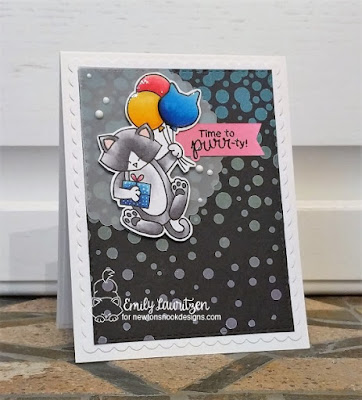 While the background dried, I worked on coloring up my sweet kitty and balloons from the Newton's Birthday Balloons stamp set. I colored the kitty like my little Cloud and then tried to match the balloons to colors used in the background. I coated those with glossy accents once everything was adhered down to my card panel. Then added a little sentiment banner using one of the sentiments in that same set.
