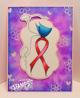 Following the theme of the new challenge, I've kept my card Clean and Simple. Sort of. I decided I wanted to try making my own background with this card. So I clear embossed some flowers and hearts onto white card stock and then took some pink, purple, and blue ink pads and used a cotton ball to apply the ink to the paper. Now, my ink pads are pretty crappy...and the cotton balls I used were worse...so the ink didn't spread as nicely as I wanted it to. But in the end I think it looks ok. The little splotchy parts seem to work even if they weren't intended.