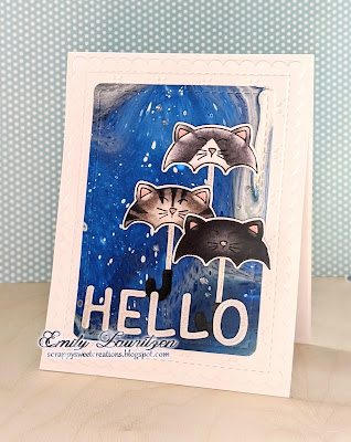 Once that was all adhered together, I die cut and colored up 3 of the Umbrella Pals kitties so they looked like the 3 cats we've had in our family. Then arranged them so they cascaded up the card. I used the Essential Alphabet Die to cut out the word Hello twice and layered that along the bottom of the card panel.